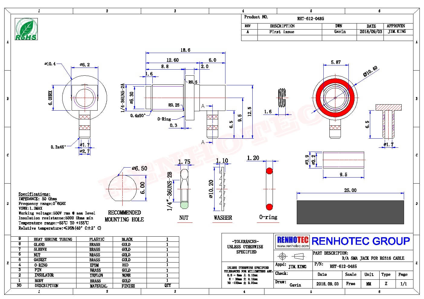 - 耐电压:接RG142,RG405线缆时为1000 V rms