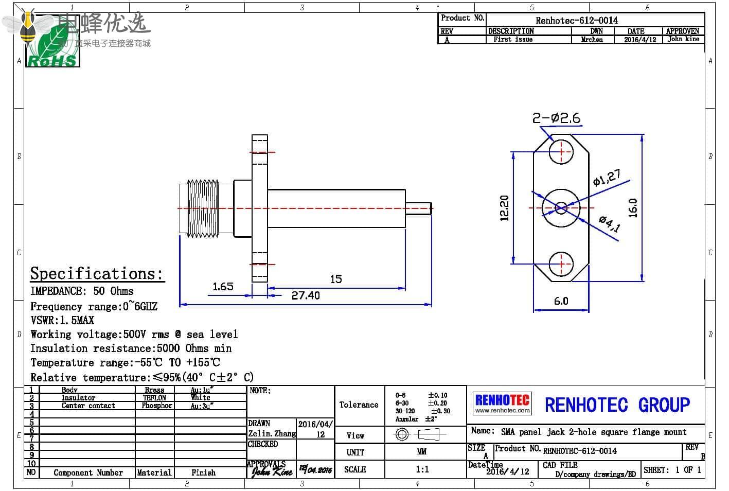 接RG142,RG405线缆时为170 V rms - 中心接触电阻:≦ 6.0mΩ (Milliohms max.)