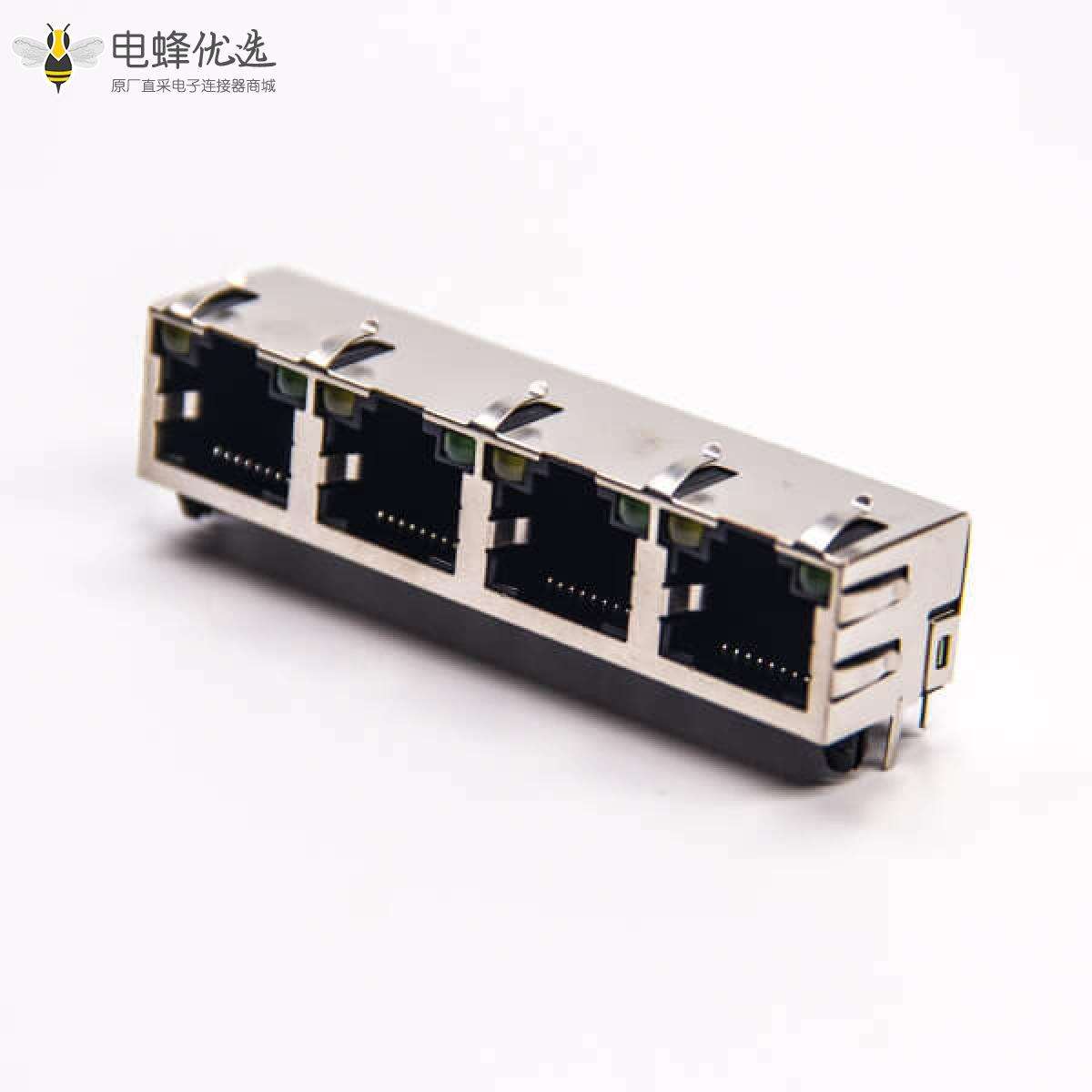RJ45插座,8P8C,4端口,1*4,弯式90°,触头镀金,插孔,PCB板安装,带屏蔽,带灯,不带滤波;